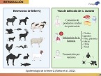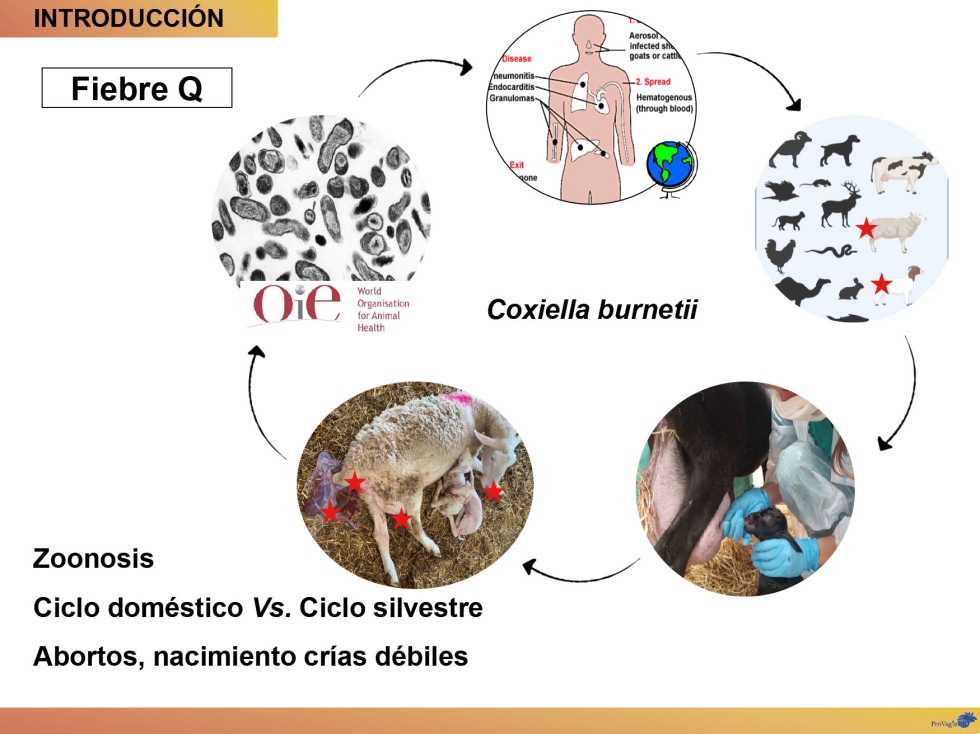 Dentro del ciclo epidemiológico de la fiebre Q, tenemos un ciclo que se denomina silvestre, donde se encuentra la implicación de diferentes ungulados, mamíferos y aves; y el ciclo doméstico, focalizándonos en los pequeños rumiantes, a los que siempre se les ha acusado de ser el principal reservorio y fuente de transmisión de fiebre Q para los humanos. La clínica principalmente es abortiva a término de gestación, así como el nacimiento de crías débiles al parto y otros problemas reproductivos en estas especies.
