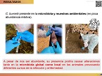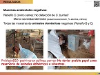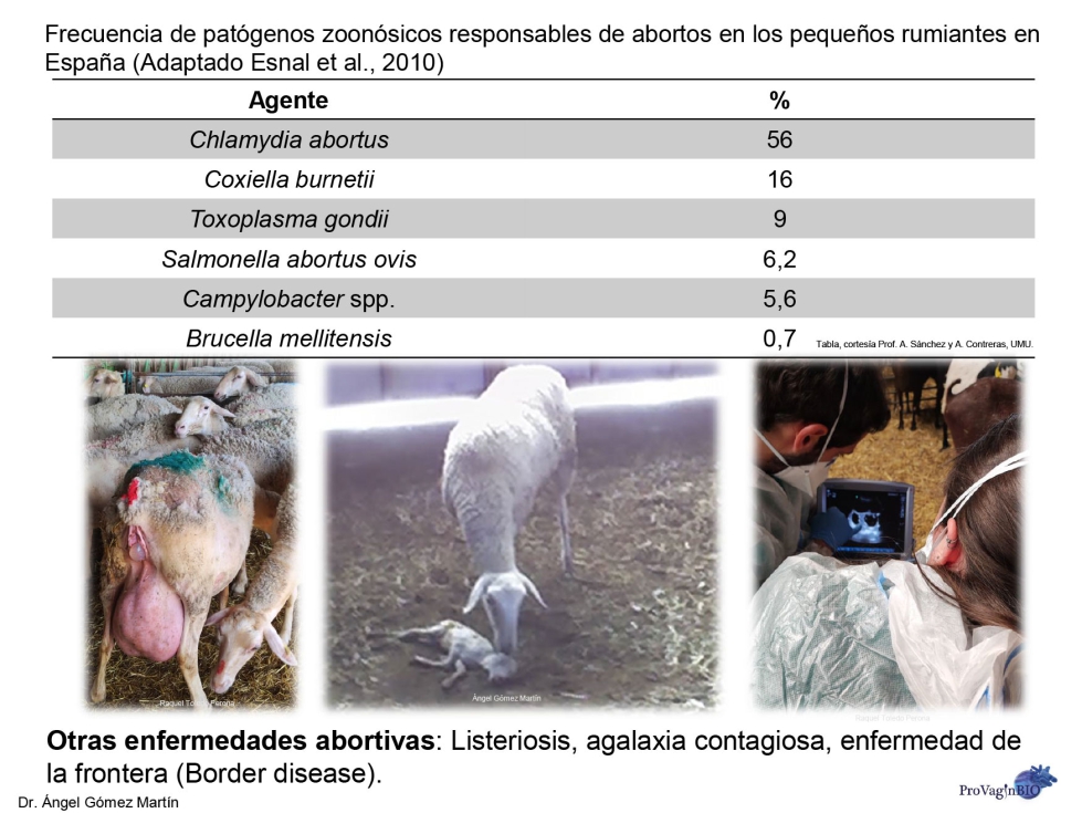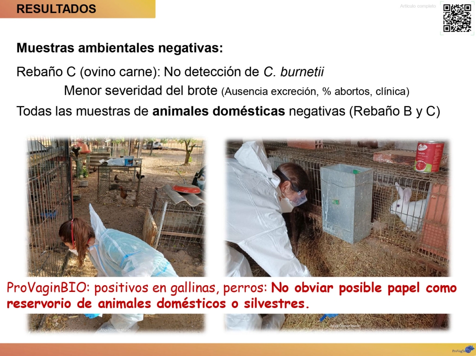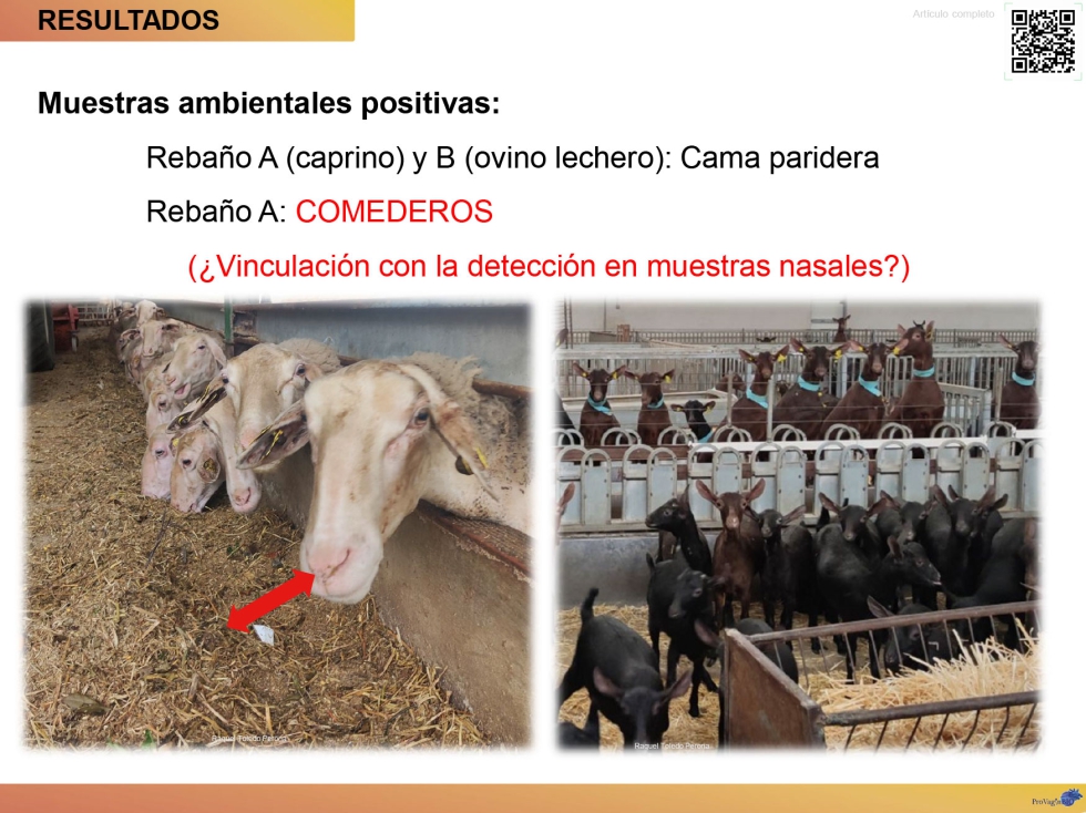 Se tomaron muestras ambientales de los tres rebaños. Se tomaron muestras de las camas de paridera y, como era de esperar, en los dos rebaños con más tasas de abortos y en los únicos donde se había detectado el patógeno en muestras de las hembras, en ambas se detectó el patógeno en las camas. Además, como novedoso de este estudio, se confirmó a los comederos como posible riesgo de transmisión del patógeno. Se detectó en el rebaño caprino ADN de la bacteria en los comederos, por lo que podría actuar como fuente de transmisión entre animales, favoreciendo el contagio directo entre ellos. Prácticamente el 90% de las cabras presentaban muestras positivas a nivel de la nasofaringe. Por tanto, las secreciones nasales podrían contaminar el comedero y favorecer esta transmisión entre los animales de la explotación. En el último rebaño, en el de ovino de carne, con el 10% de abortos, no se detectó el patógeno ni en los animales ni en muestras ambientales. También se tomaron muestras de animales domésticos, de heces principalmente de gallinas y de aves, por la cercanía que tenían con las ovejas. Ninguna de las muestras fue positiva, pero en otros estudios, en brotes clínicos más severos de la enfermedad, sobre todo en el caso del caprino, sí se obtuvieron muestras positivas tanto de perros como de aves. Por tanto, no olvidarnos del papel que pueden tener estos animales domésticos en la transmisión de la enfermedad.