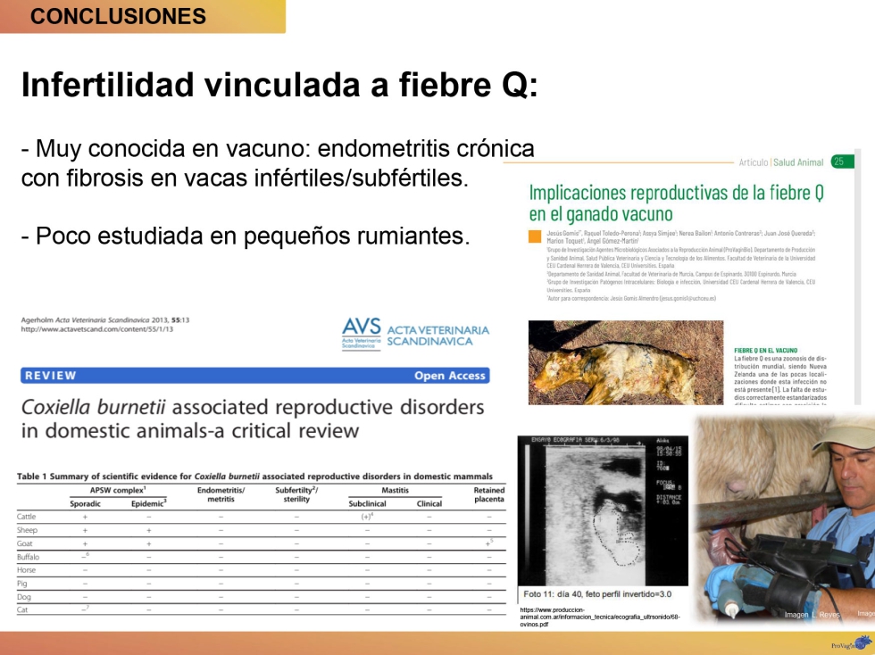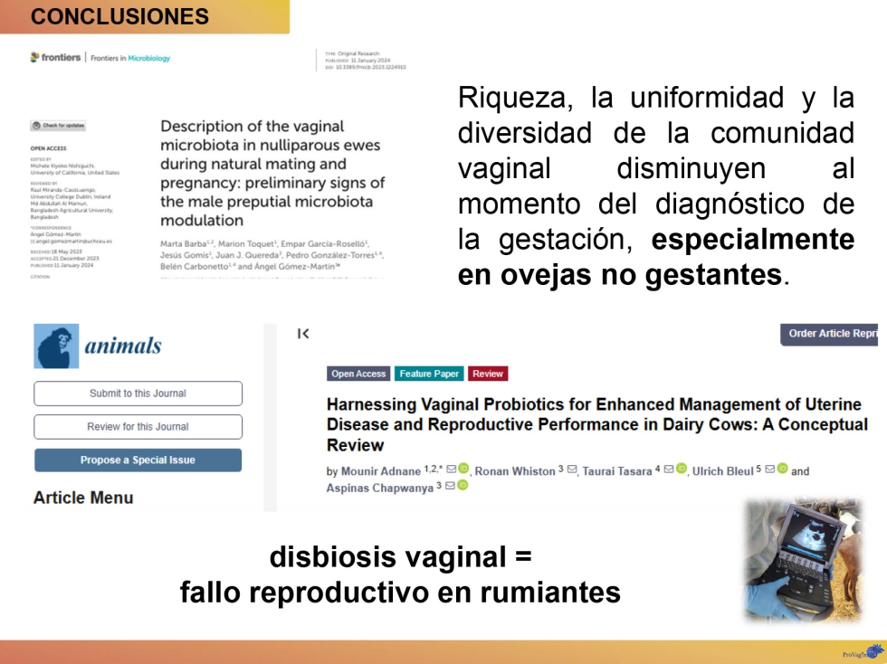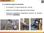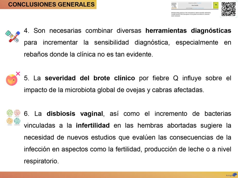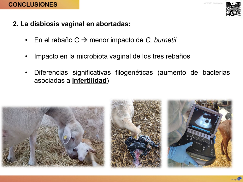Por tanto, las principales conclusiones de esta parte del estudio es que se observaron por primera vez una disbiosis, unos cambios en la riqueza, en la composición microbiana a nivel vaginal tras un aborto en explotaciones donde se encuentra circulando Coxiella burnetii. Además, esta diferencia se observó al comparar hembras abortadas y no abortadas, pero es que también estas diferencias se pudieron observar intrarrebaño en una explotación donde el brote clínico había sido categorizado como leve. Por tanto, esto evidencia un impacto sobre la microbiota y, además, los resultados con la vinculación de agentes relacionados con infertilidad y problemas reproductivos, ya que se favorece el incremento de determinados patógenos. Estos resultados van en coherencia con estudios publicados previamente también por el grupo de investigación, donde se sabe que la riqueza, la uniformidad y la diversidad son especialmente menores en ovejas no gestantes. Por el contrario, una disbiosis vaginal es el enemigo del éxito reproductivo. A pesar de que en vacuno la infertilidad es la principal clínica que reportan los veterinarios por fiebre Q, en pequeños rumiantes queda mucho por investigar.