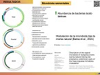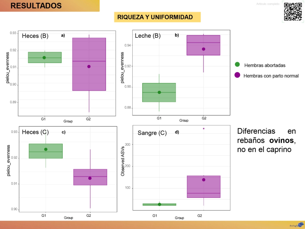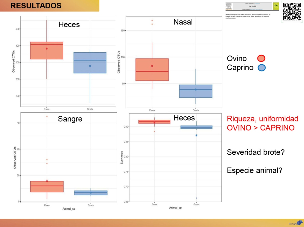 Por tanto, los primeros resultados metagenómicos en términos de diversidad de los rebaños ovinos indican que se detectaron estas diferencias en función del grupo de hembras abortadas y no abortadas. A nivel fecal y de leche, en el rebaño lechero había diferencias significativas entre las hembras abortadas y no abortadas, evidenciando que la microbiota fecal y la láctea de las hembras con un parto normal era más uniforme y no había ninguna diferencia en la dominancia de algún taxón bacteriano. Y en el caso del ovino de carne, en las hembras abortadas la muestra fecal era más homogénea, y, por el contrario, en la microbiota sanguínea, presentaba una mayor riqueza microbiana en el caso de las hembras con parto normal. En el caso del caprino, esta diferencia no se observó en ninguna de las regiones anatómicas estudiadas. Por tanto, ello se vincula a la siguiente conclusión: un brote clínico severo de la enfermedad tiene un impacto sobre la microbiota global. También se vio reflejado en el número de comunidades bacterianas, donde en las muestras caprinas era mucho menor que en comparación a las muestras ovinas.