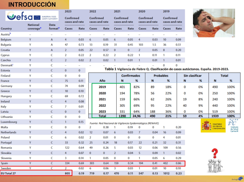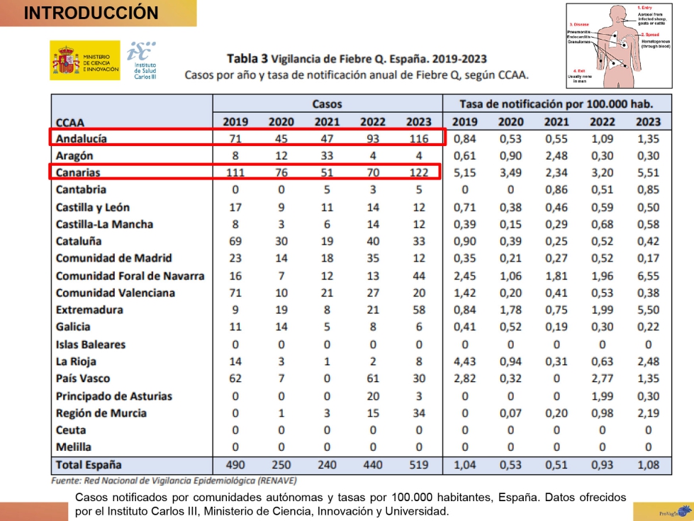 A nivel de rebaño, los laboratorios privados reportan esta zoonosis como una de las principales zoonosis abortivas diagnosticadas en los rebaños ovinos y caprinos. Por tanto, esto tiene una serie de implicaciones ya no solo sanitarias, sino también económicas en los rebaños. La transmisión principal de Coxiella burnetii se produce por la inhalación de la bacteria a partir de diferentes vías. Además, la EFSA también ha descrito otras vías de transmisión menos frecuente a humanos, que sería el consumo de productos crudos o sin pasteurizar, o bien la transmisión por vectores, en este caso de mayor importancia en el ciclo silvestre de la enfermedad, que es el caso de las garrapatas. La bibliografía contempla la vía vaginal, fecal y láctea de las principales identificadas para la excreción de Coxiella burnetii en rumiantes domésticos en general.