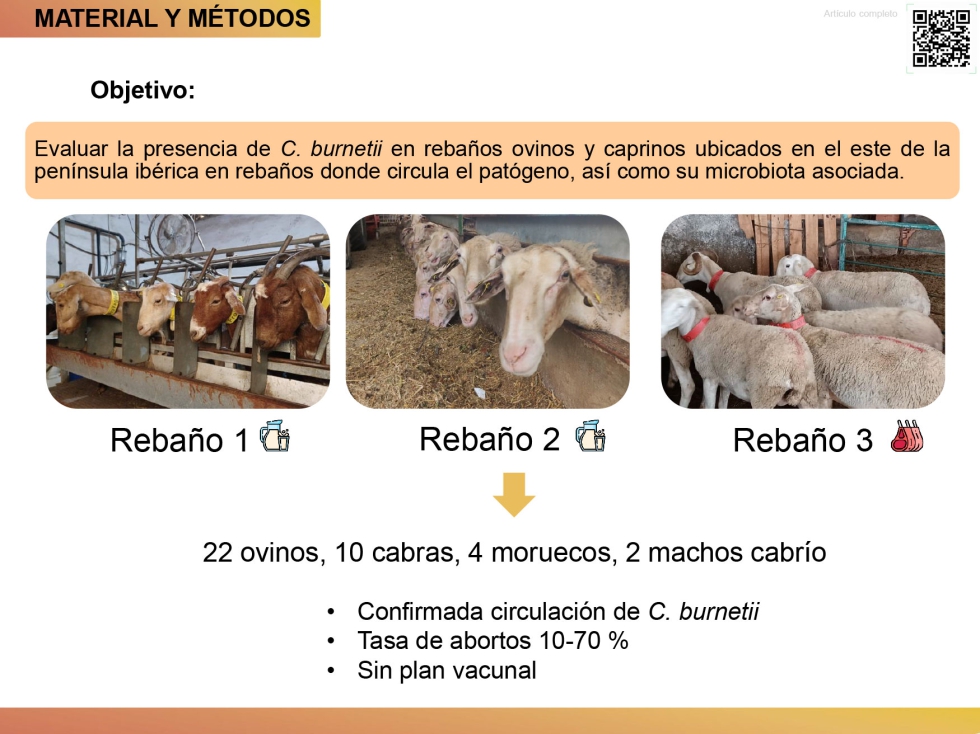 Se seleccionaron tres rebaños, de los que uno era de caprino lechero y los otros dos eran ovinos, en concreto de ovino lechero y ovino de carne semi-extensivo. Se buscaban rebaños donde nunca se hubiera implementado la vacunación frente a fiebre Q, para partir de un nivel similar. Además, en estos rebaños ya se contaba previamente al inicio del estudio con una confirmación del laboratorio de que al menos C. burnetii estaba circulando en la explotación, ya bien sea por serología o por diagnóstico basado en PCR vaginal o de fetos y placentas.