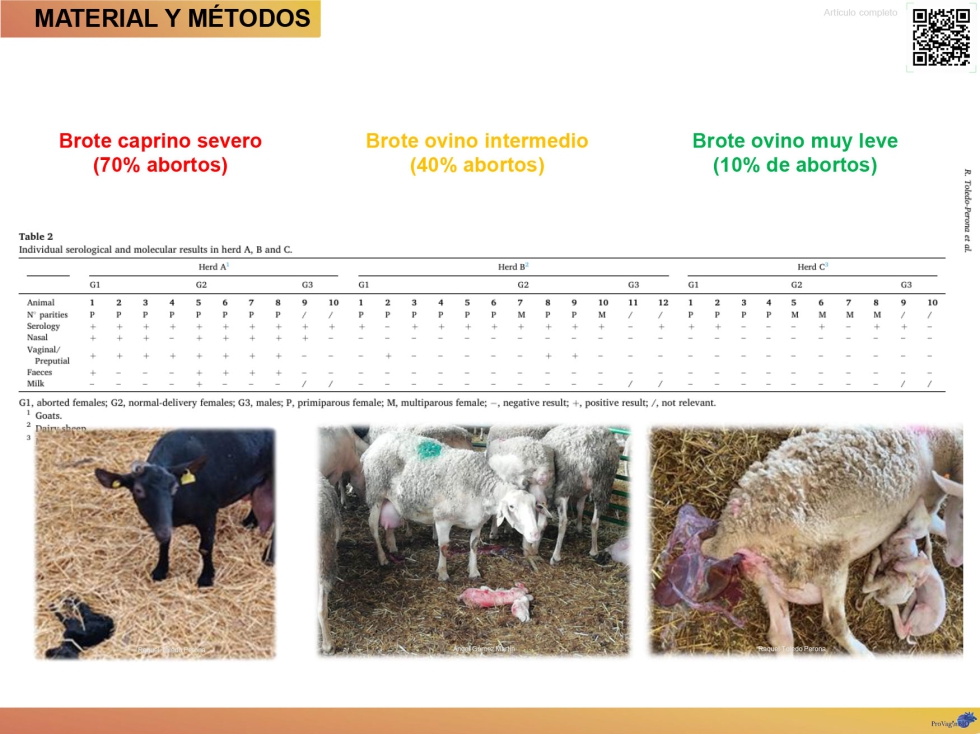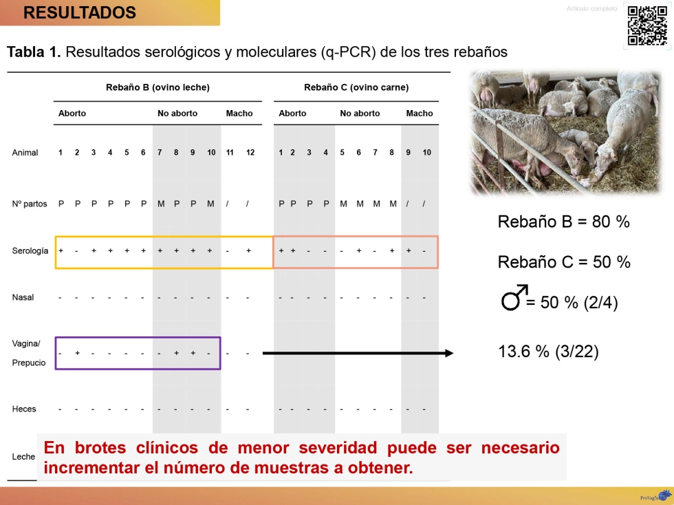 Pasando a los rebaños ovinos, la seropositividad varió en función de cada uno de ellos. El rebaño de ovino lechero, que tenía una tasa de abortos del 40%, mostró una seropositividad del 80% frente al rebaño ovino mixto de carne, donde la seropositividad fue del 50%. En las muestras analizadas por PCR, únicamente en el rebaño lechero se detectaron muestras positivas a nivel bajo, en tres de las ovejas analizadas independientemente abortadas o no abortadas. Por lo tanto, únicamente un diagnóstico serológico podría no reflejar la realidad epidemiológica de un brote clínico de la enfermedad en los rebaños ovinos y caprinos. Por tanto, ello remarca la necesidad de combinar diferentes técnicas diagnósticas, como en este caso sería la PCR. En brotes clínicos no muy severos, podría ser necesario incluso aumentar el número de muestras para llegar a conocer un diagnóstico más fiable.