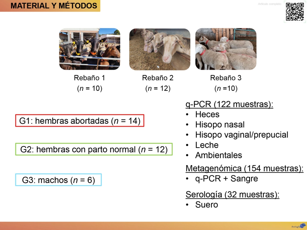 De estos animales, se seleccionaron entre 10 y 12 animales de cada explotación, seleccionando dos machos de cada uno de los rebaños y las hembras se dividieron en dos grupos en función de si habían abortado o habían tenido un parto viable o normal. Tanto de hembras como de machos se obtuvieron muestras genitales, como vagina, prepucio, muestras de la nasofaringe, heces, leche y muestras ambientales para el análisis molecular por PCR y metagenómica. Además, se realizó también un estudio de seropositividad donde se obtuvieron muestras de sangre para ver cuál era el estado de estos animales y la sangre también se utilizó para realizar el estudio de la microbiota sanguínea.