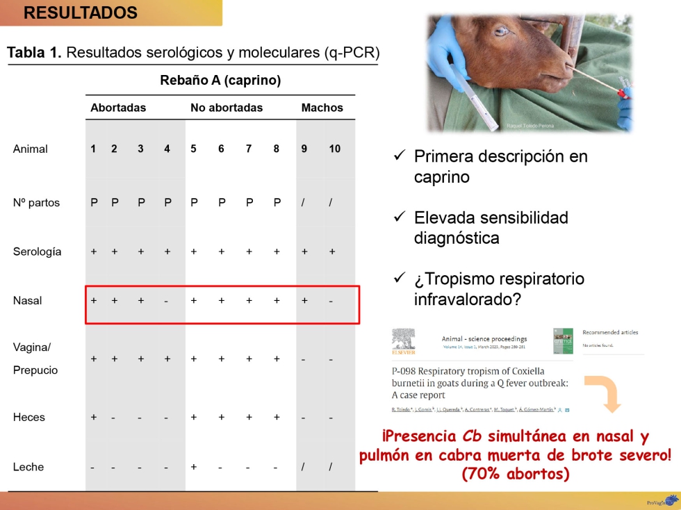 Los resultados serológicos y de PCR de cada uno de los animales en los diferentes rebaños indican, tras el análisis estadístico, que no había diferencias significativas entre las hembras que habían abortado y las hembras con un parto normal en términos de seropositividad y detección del patógeno Coxiella burnetii en cualquier de las vías estudiadas. Por tanto, este hecho evidencia, verifica y corrobora una de las hipótesis, que es la importancia de incluir a todos los animales del rebaño en las pautas de control t bioseguridad frente a fiebre Q en los rebaños ovinos y caprinos. En el caso del rebaño caprino, que tenía un brote severo con un 70% de tasa de abortos, se observa que el 100% de los animales era seropositivo, incluyendo machos y hembras, y además el 100% de las hembras excretaban por alguna de las vías estudiadas, principalmente la vía nasal y vaginal. También se detectó el patógeno a nivel nasofaríngeo, lo que representa la primera descripción y la primera evidencia científica de presencia de Coxiella burnetii en las fosas nasales de caprinos tras un brote clínico de la enfermedad, mostrando una elevada sensibilidad diagnóstica comparable a la muestra vaginal. Por tanto, evidencia y revaloriza la hipótesis del posible papel infravalorado a nivel respiratorio que tiene la enfermedad. De hecho, esta explotación se siguió monitorizando y en un animal se detectó simultáneamente la presencia de Coxiella burnetii a nivel nasal, a nivel respiratorio de las fosas nasales, nasofaringe y en tejido pulmonar. Por tanto, son necesarios más estudios, pero podría haber un papel infravalorado del sistema respiratorio.