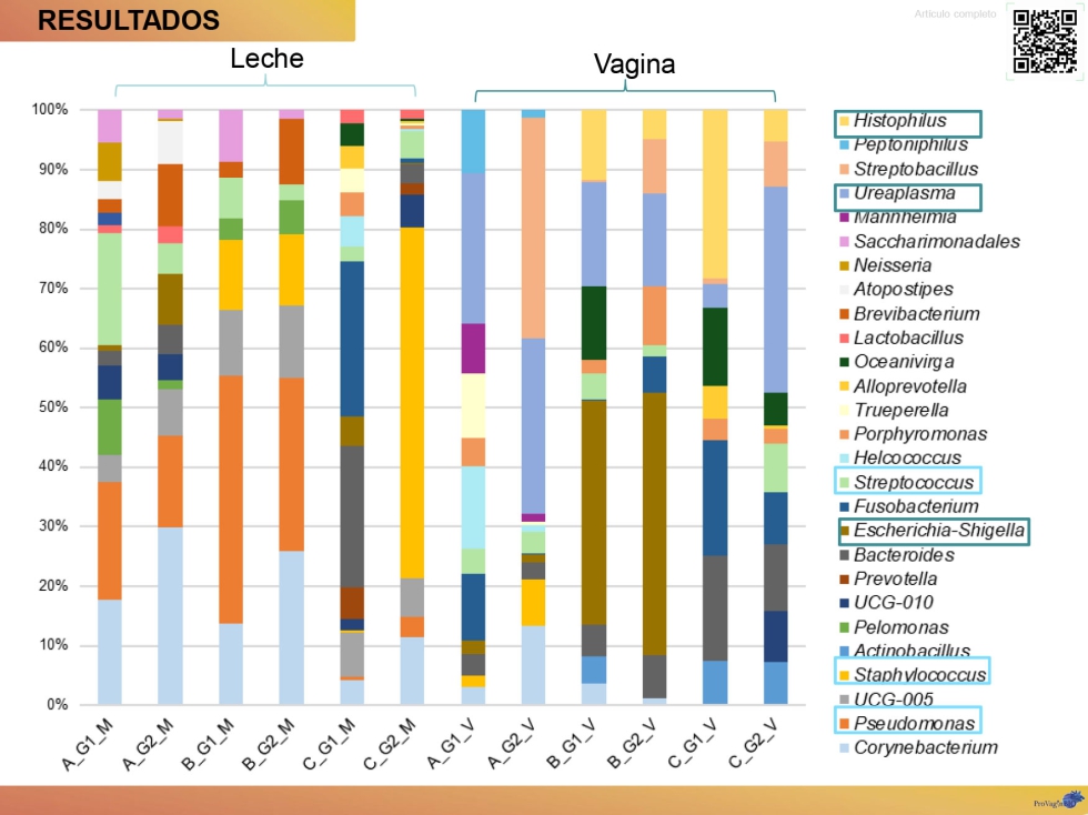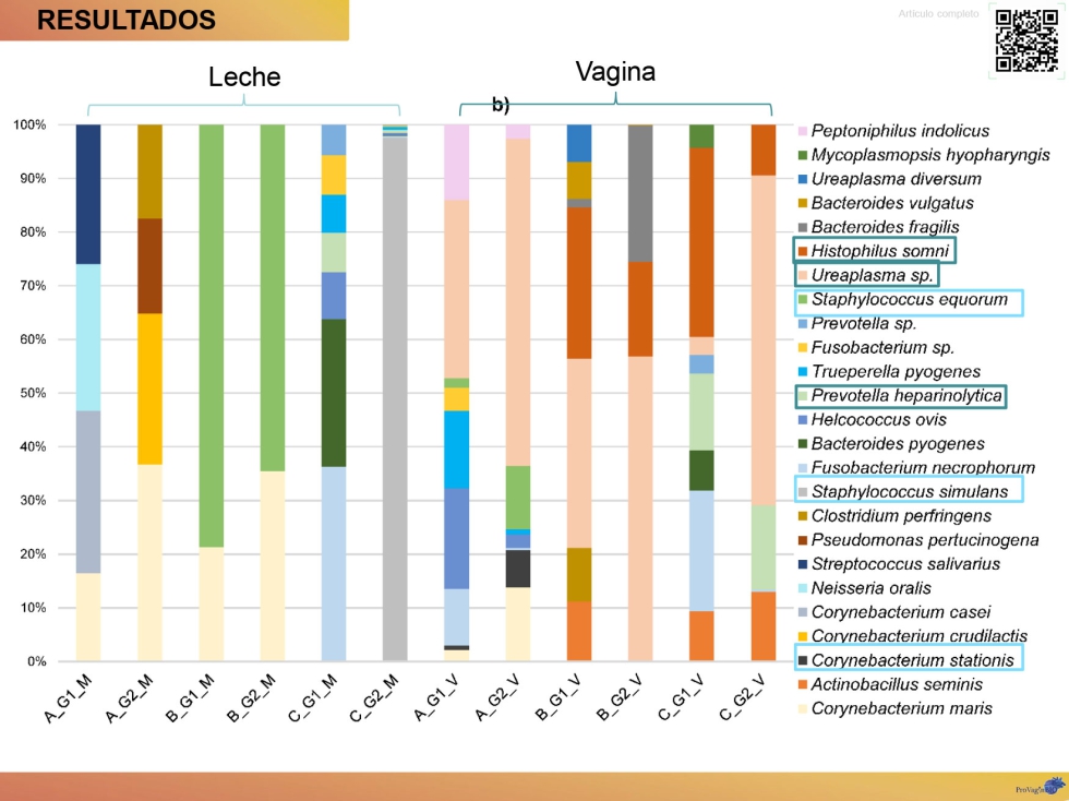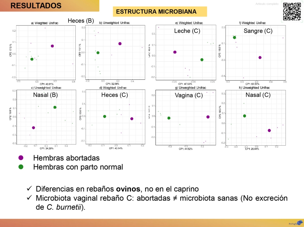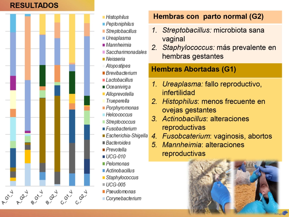 Se observó una vinculación de determinados géneros bacterianos con un grupo determinado de hembras del estudio. Por tanto, tomando que géneros bacterianos como Streptobacilos o Estafilococos, forman parte de una microbiota vaginal sana, según estudios previos metagenómicos, se observó con mayor abundancia en las hembras que habían tenido un parto normal. Por el contrario, en las hembras abortadas, se observaron otros genéros vinculados muchos de ellos a problemas reproductivos y de infertilidad en los pequeños rumiantes.