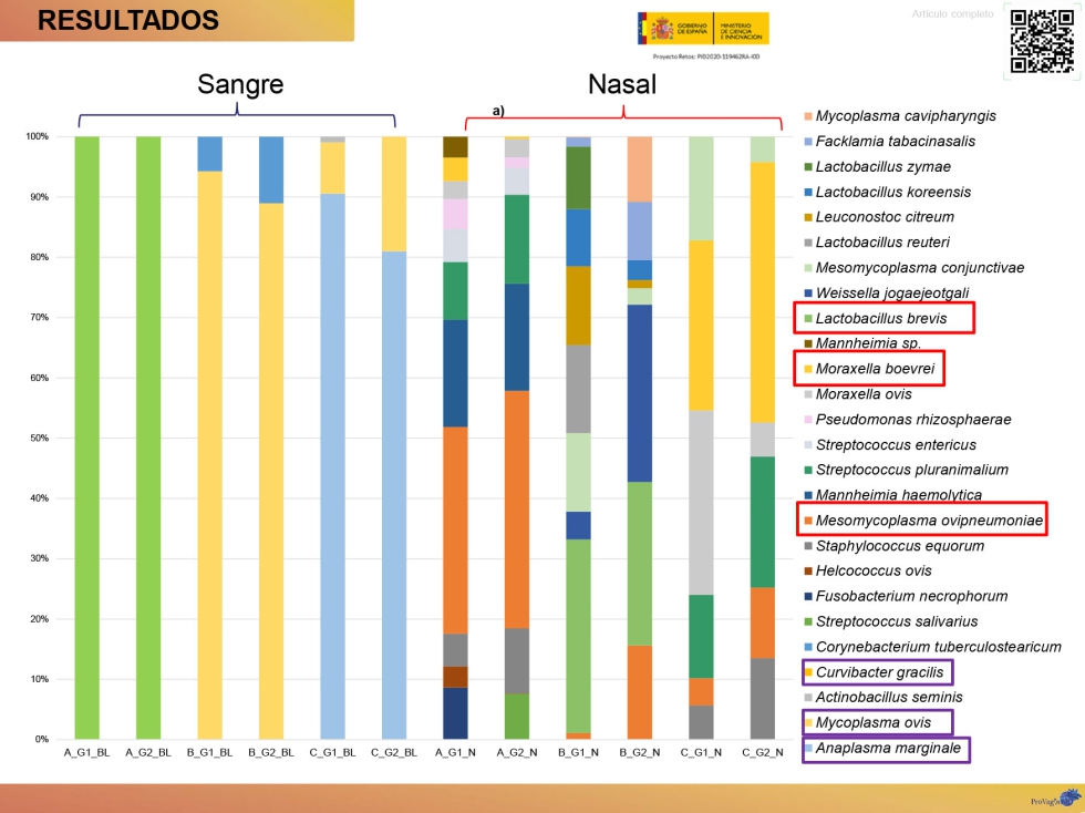 En el caso del estudio taxonómico, se obtuvo la primera descripción de la microbiota de un animal en diferentes localizaciones anatómicas. A nivel de sangre, se detectaron como principales géneros Estafilococos, Pseudomonas, Micoplasma o Anaplasma. A nivel fecal y nivel nasal, están Mannheimia, Moraxella y Lactobacillus. Destacar que a nivel nasal representa el primer reporte de la abundancia y la diversidad de bacterias con potencial antimicrobiano, como son las bacterias acidolácticas. Pasando a la microbiota láctea o vaginal, en leche los principales géneros resultaron ser Streptococos, Estafilococos y Pseudomonas. Y en el caso de la vagina, los géneros con mayor abundancia fueron Histophilus, Ureaplasma y Escherichia-Shigella.