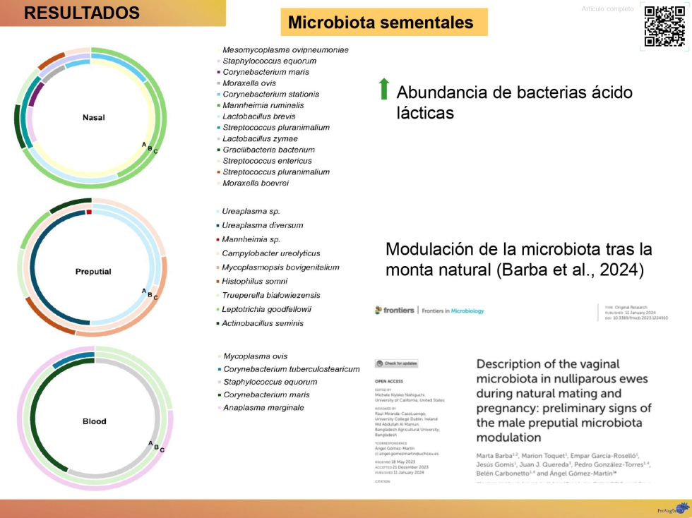 Respecto a la microbiota observada en los sementales, a nivel nasal también se observó la elevada abundancia de estas bacterias acidolácticas con potencial probiótico. Y, a nivel de la microbiota prepucial, destacan diversas especies que también eran más abundantes a nivel de la microbiota vaginal. Estos resultados van en coherencia con estudios previos que ya explican o evidencian una posible modulación de la microbiota reproductiva tras la monta, especialmente tras la monta natural, en el caso del ovino.